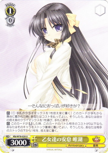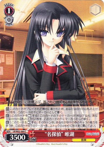 ![]() ![]() | LB/W06-061 “最強の女子” 唯湖 キャラ ブースターパック リトルバスターズ!エクスタシー U 色:赤 レベル:2 コスト:1 パワー:8000 ソウル:1 特徴:音楽 トリガー:ソウル 【自】[手札のクライマックスを1枚控え室に置く]このカードが手札から舞台に置かれた時、あなたはコストを払ってよい。そうしたら、あなたは相手のレベル0以下のキャラを1枚選び、控え室に置く。 ・・・楽しいこと、それが私のモラルの大前提だよ 作品名:リトルバスターズ!エクスタシー illust:VisualArt’s/Key |