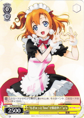 ![]() ![]() | LL/W24-057 メイド服の海未 キャラ ブースターパック ラブライブ! U 色:赤 レベル:0 コスト:0 パワー:500 ソウル:1 特徴:音楽/メイド 【永】他のあなたの前列の中央の枠のカード名に「穂乃果」を含むキャラに、パワーを+500。 【自】絆/「μ’sの牽引役 穂乃果」[①](このカードがプレイされて場に出た時、あなたはコストを払ってよい。そうしたら、あなたは自分の控え室の「μ’sの牽引役 穂乃果」を1枚選び、手札に戻す) おかえりなさいませ、ご主人様・・・ 作品名:ラブライブ! School idol project |