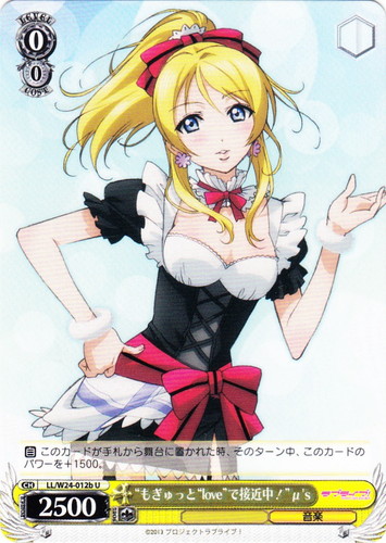 ![]() ![]() | LL/W24-012c “もぎゅっと”love“で接近中!” μ’s キャラ ブースターパック ラブライブ! U 色:黄 レベル:0 コスト:0 パワー:2500 ソウル:1 特徴:音楽 【自】このカードが手札から舞台に置かれた時、そのターン中、このカードのパワーを+1500。 作品名:ラブライブ! School idol project |