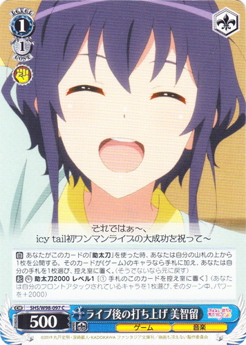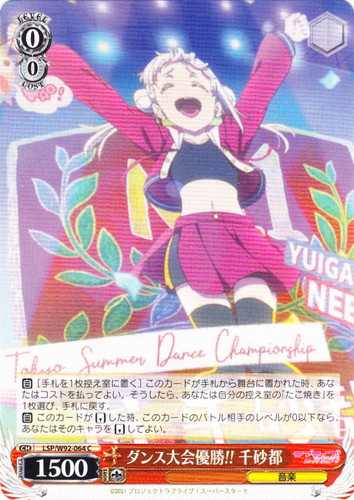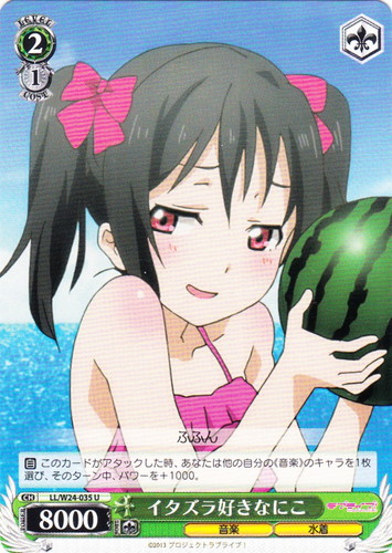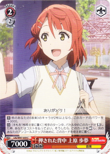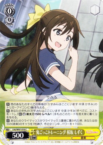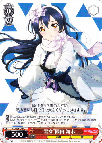 ![]() ![]() | LL/W24-006d “夏色えがおで1.2.Jump!” μ’s キャラ ブースターパック ラブライブ! R 色:黄 レベル:1 コスト:0 パワー:5000 ソウル:1 特徴:音楽 【自】[①]このカードがアタックした時、クライマックス置場に「Mermaid festa vol.1」があるなら、あなたはコストを払ってよい。そうしたら、あなたは自分の山札を見て《音楽》のキャラを1枚まで選んで相手に見せ、手札に加え、その山札をシャッフルする。 作品名:ラブライブ! School idol project |