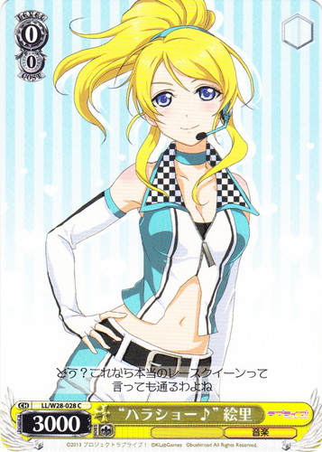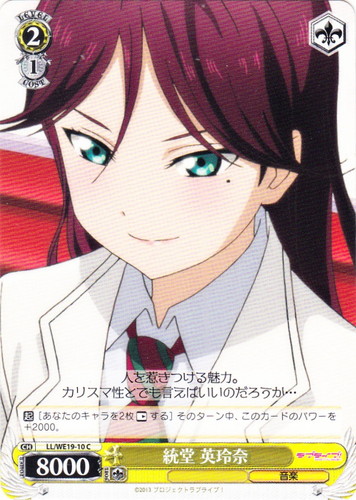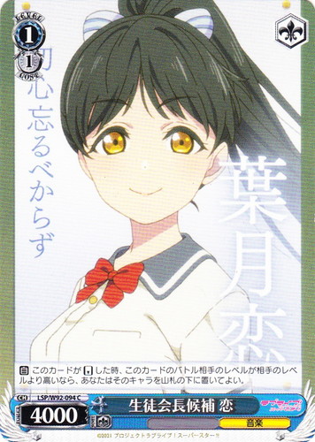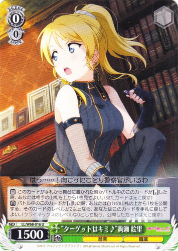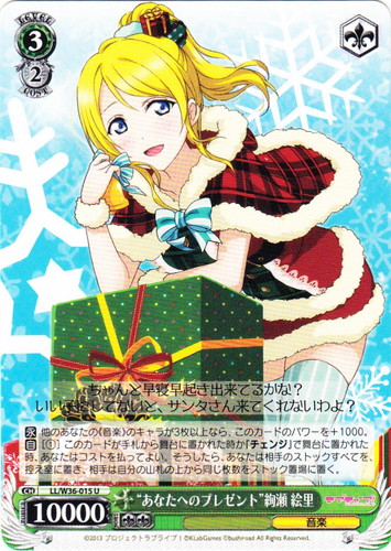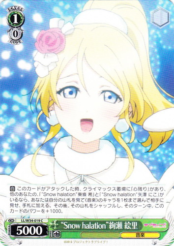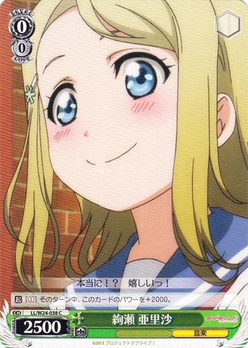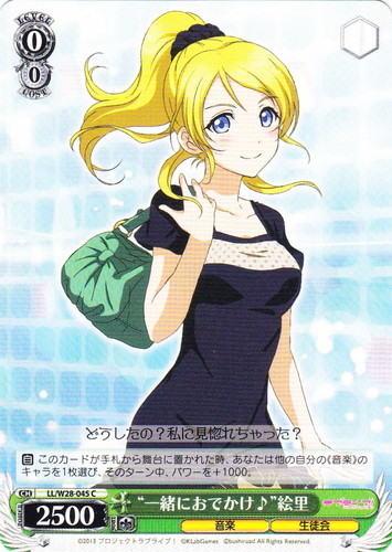 ![]() ![]() | LL/W24-044 ロシア人とのクォーター 絵里 キャラ ブースターパック ラブライブ! C 色:緑 レベル:2 コスト:2 パワー:9000 ソウル:2 特徴:音楽/生徒会 作品名:ラブライブ! School idol project |