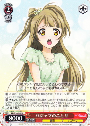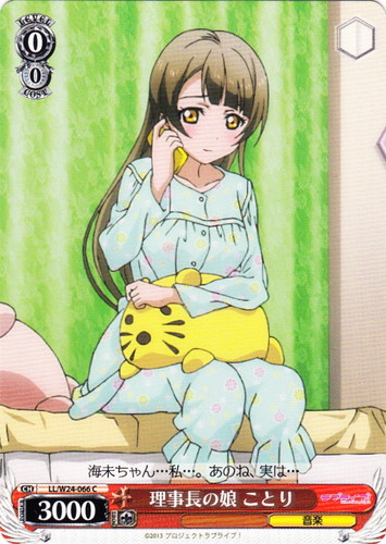 ![]() ![]() | LL/W24-066 理事長の娘 ことり キャラ ブースターパック ラブライブ! C 色:赤 レベル:0 コスト:0 パワー:3000 ソウル:1 特徴:音楽 海未ちゃん・・・私・・・。あのね、実は・・・ 作品名:ラブライブ! School idol project |