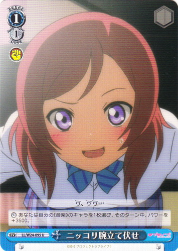 ![]() ![]() | LL/W24-095 ニッコリ腕立て伏せ イベント ブースターパック ラブライブ! U 色:青 レベル:1 コスト:1 【カウンター】あなたは自分の《音楽》のキャラを1枚選び、そのターン中、パワーを+3500。 う、うう・・・ 作品名:ラブライブ! School idol project |