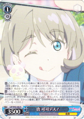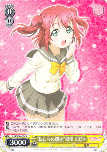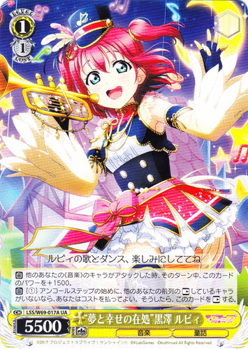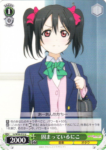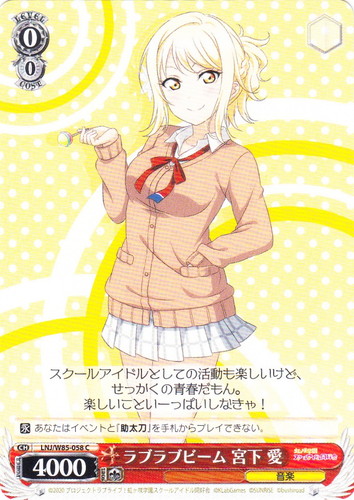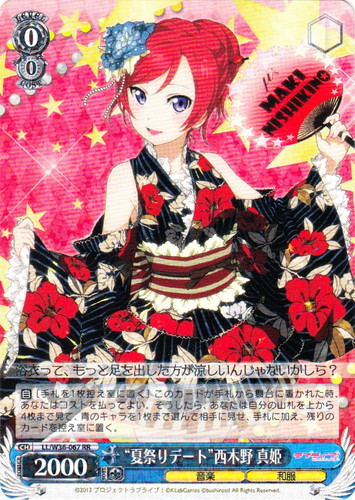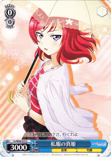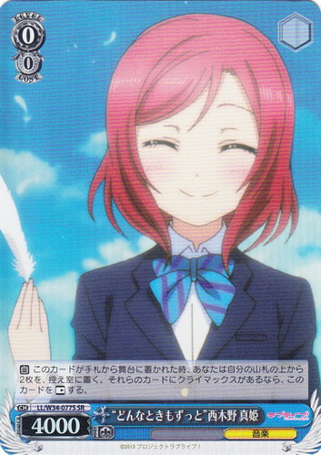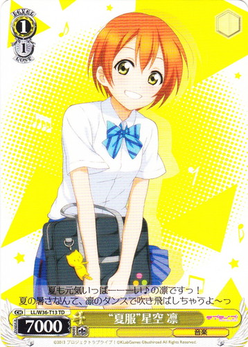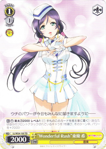 ![]() ![]() | LL/W24-104 “Wonderful Rush” 西木野 真姫 キャラ トライアルデッキ ラブライブ! TD 色:黄 レベル:1 コスト:0 パワー:5500 ソウル:1 特徴:音楽 頑張っちゃうんだから――応援してよね? 作品名:ラブライブ! School idol project |