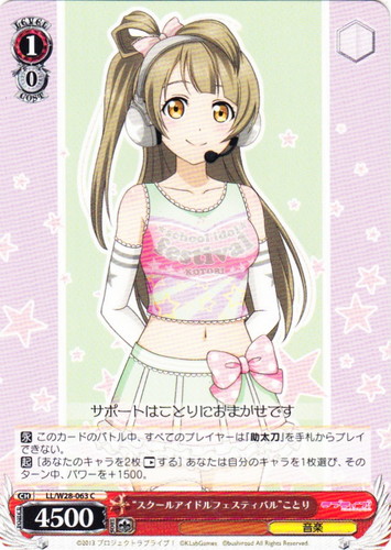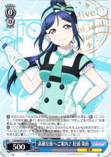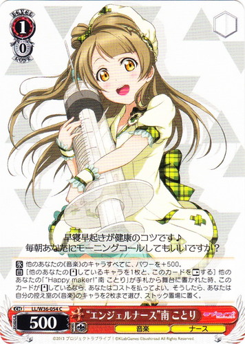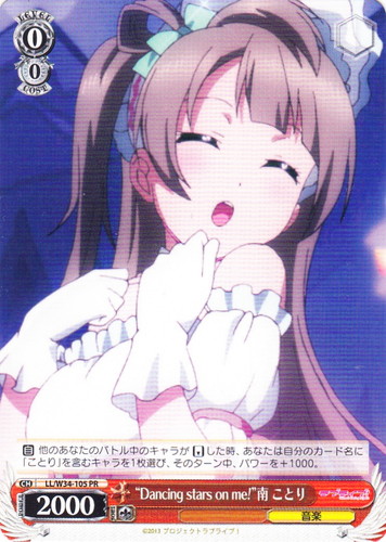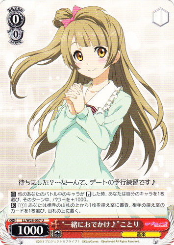 ![]() ![]() | LL/W24-108 “Wonderful Rush” 南 ことり キャラ トライアルデッキ ラブライブ! TD 色:黄 レベル:2 コスト:2 パワー:8500 ソウル:1 特徴:音楽 トリガー:ソウル 【永】前列の中央の枠にこのカードがいるなら、このカードのパワーを+1000。 小さな笑顔を少しでも届けることができたら 作品名:ラブライブ! School idol project |