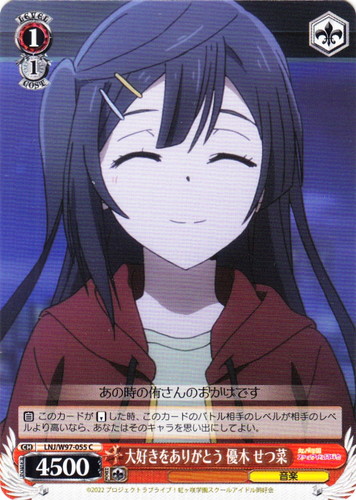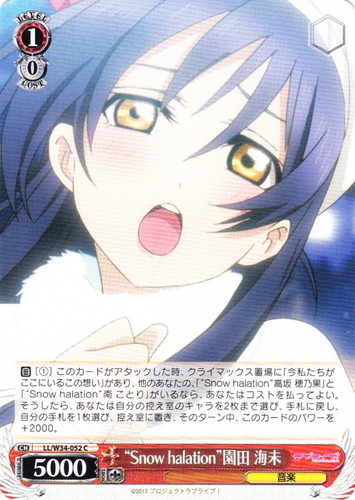 ![]() ![]() | LL/W24-012i “もぎゅっと”love“で接近中!” μ’s キャラ ブースターパック ラブライブ! U 色:黄 レベル:0 コスト:0 パワー:2500 ソウル:1 特徴:音楽 【自】このカードが手札から舞台に置かれた時、そのターン中、このカードのパワーを+1500。 作品名:ラブライブ! School idol project |