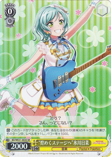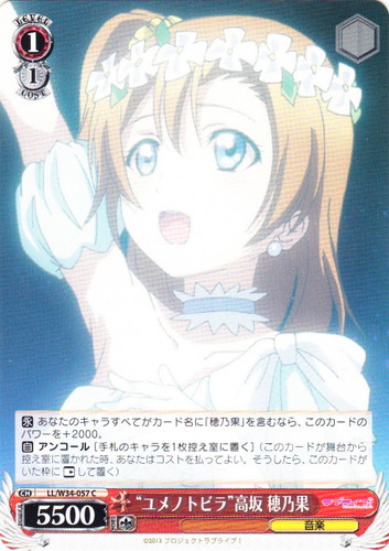 ![]() ![]() | LL/W24-109S “Wonderful Rush” 高坂 穂乃果 キャラ トライアルデッキ ラブライブ! SR 色:黄 レベル:3 コスト:2 パワー:10000 ソウル:2 特徴:音楽 トリガー:ソウル 【自】このカードが手札から舞台に置かれた時、あなたは自分の山札を見て《音楽》のキャラを1枚まで選んで相手に見せ、手札に加える。その山札をシャッフルする。 【自】他のあなたの《音楽》のキャラがアタックした時、そのターン中、このカードのパワーを+1000。 じゃあ始めよ! 作品名:ラブライブ! School idol project |