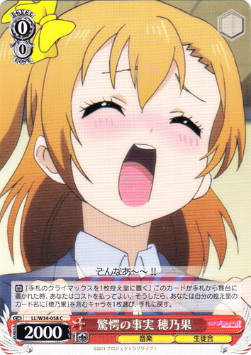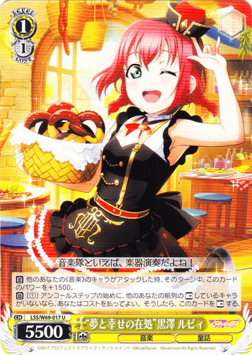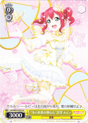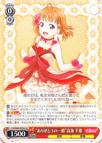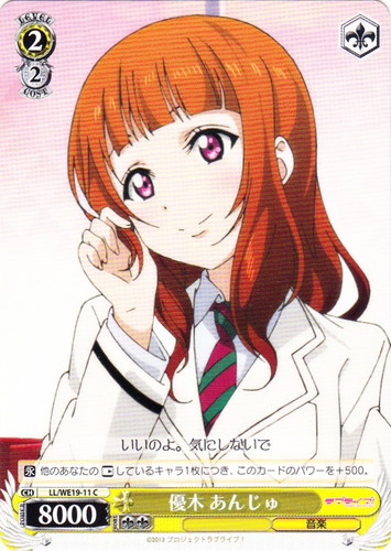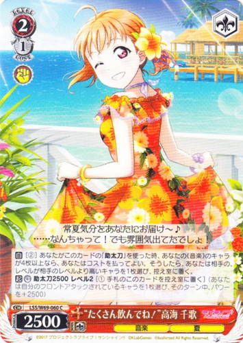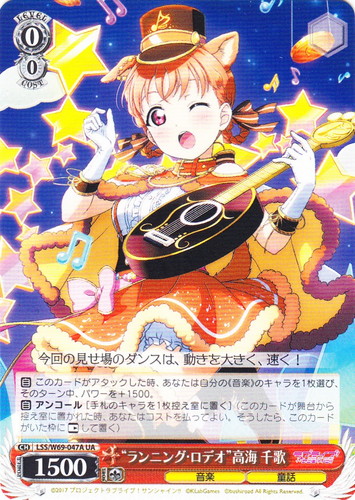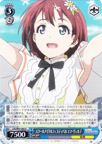 ![]() ![]() | LL/W24-006h “夏色えがおで1.2.Jump!” μ’s キャラ ブースターパック ラブライブ! R 色:黄 レベル:1 コスト:0 パワー:5000 ソウル:1 特徴:音楽 【自】[①]このカードがアタックした時、クライマックス置場に「Mermaid festa vol.1」があるなら、あなたはコストを払ってよい。そうしたら、あなたは自分の山札を見て《音楽》のキャラを1枚まで選んで相手に見せ、手札に加え、その山札をシャッフルする。 作品名:ラブライブ! School idol project |