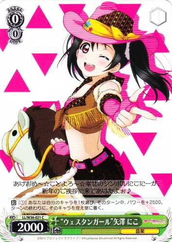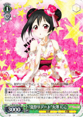 ![]() ![]() | LL/W24-101 “Wonderful Rush” 矢澤 にこ キャラ トライアルデッキ ラブライブ! TD 色:黄 レベル:0 コスト:0 パワー:3000 ソウル:1 特徴:音楽 あなたのハッピーにこにこに~っ♡♡♡ 作品名:ラブライブ! School idol project |