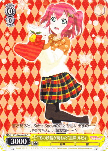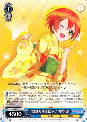 ![]() ![]() | LL/W24-107 “Wonderful Rush” 星空 凛 キャラ トライアルデッキ ラブライブ! TD 色:黄 レベル:2 コスト:1 パワー:8000 ソウル:1 特徴:音楽 トリガー:ソウル 【起】[①]そのターン中、このカードのソウルを+1。 キミのために、歌って踊ってたら、寒いのなんかどっかに飛んでいっちゃうもん 作品名:ラブライブ! School idol project |