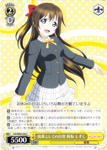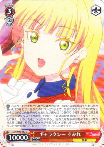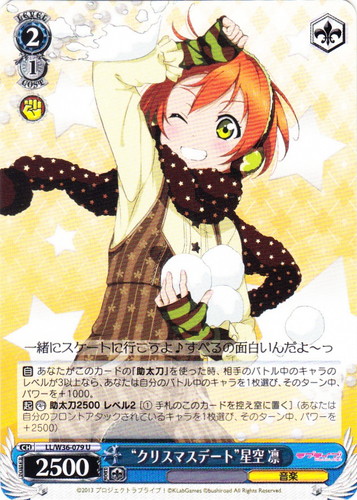 ![]() ![]() | LL/W24-008 “僕らのLIVE 君とのLIVE” 星空 凛 キャラ ブースターパック ラブライブ! R 色:黄 レベル:2 コスト:1 パワー:7500 ソウル:1 特徴:音楽 トリガー:ソウル 【自】[①]このカードのバトル相手でレベル2以上のキャラが「リバース」した時、あなたはコストを払ってよい。そうしたら、あなたは自分の山札を見て《音楽》のキャラを1枚まで選んで相手に見せ、手札に加え、その山札をシャッフルする。 【起】[あなたのキャラを2枚「レスト」する]そのターン中、このカードのパワーを+2000。 作品名:ラブライブ! School idol project |