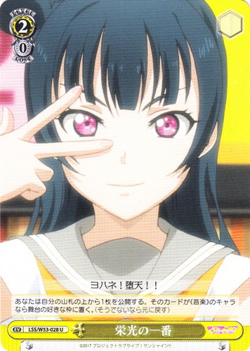 ![]() ![]() | LSS/W53-028 栄光の一番 イベント ブースターパック ラブライブ!サンシャイン!! Vol.2 U 色:黄 レベル:2 コスト:0 あなたは自分の山札の上から1枚を公開する。そのカードが《音楽》のキャラなら舞台に好きな枠に置く。(そうでないなら元に戻す) ヨハネ!堕天!! 作品名:ラブライブ!サンシャイン!! |