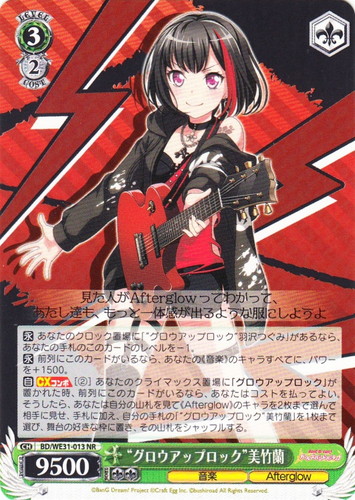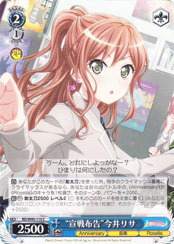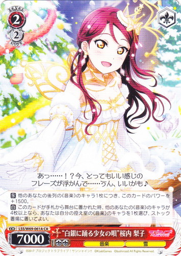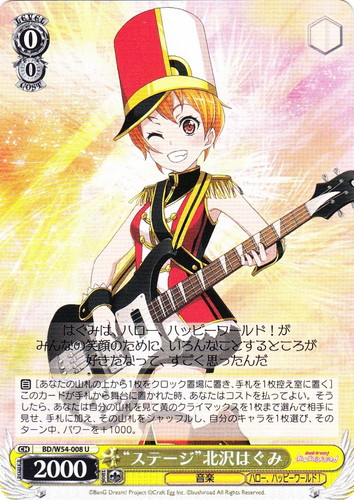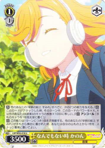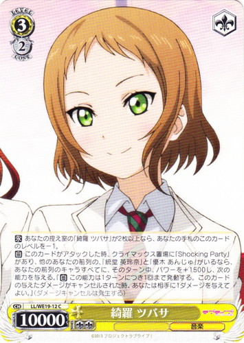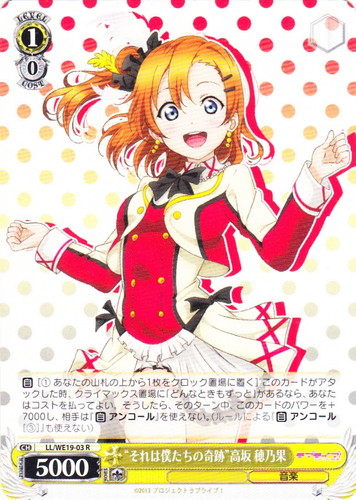 ![]() ![]() | LL/W24-014 “僕らは今の中で” μ’s キャラ ブースターパック ラブライブ! U 色:黄 レベル:3 コスト:2 パワー:10000 ソウル:2 特徴:音楽 トリガー:ソウル 【自】このカードが手札から舞台に置かれた時か「チェンジ」で舞台に置かれた時、あなたは自分のクロックの上から1枚を、控え室に置いてよい。 【自】このカードがアタックした時、クライマックス置場に「きっと青春が聞こえる」があるなら、あなたのキャラすべてに、そのターン中、パワーを+3000。 作品名:ラブライブ! School idol project |