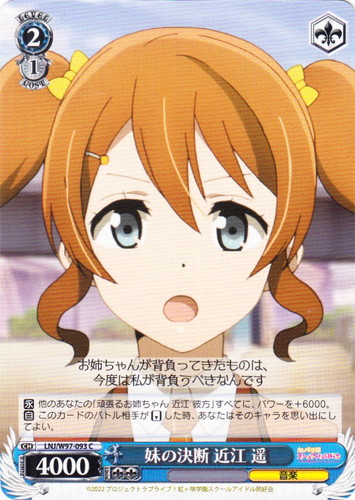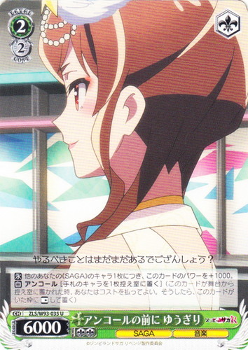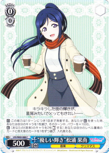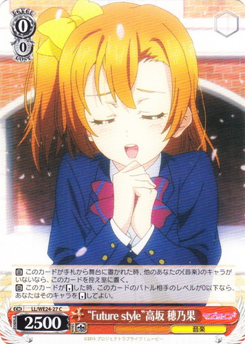 ![]() ![]() | LL/W24-002 “僕らのLIVE 君とのLIFE” 高坂 穂乃果 キャラ ブースターパック ラブライブ! RR 色:黄 レベル:0 コスト:0 パワー:2500 ソウル:1 特徴:音楽 【自】[②]あなたのクライマックス置場に「僕らのLIVE 君とのLIFE」が置かれた時、前列にこのカードがいるなら、あなたはコストを払ってよい。そうしたら、あなたは自分の山札を見てレベル0以下の《音楽》のキャラを1枚まで選び、舞台の好きな枠に置く。その後、その山札をシャッフルし、そのターン中、そのキャラのパワーを+1000し、ソウルを+1。 作品名:ラブライブ! School idol project |