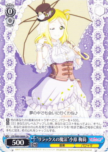 ![]() ![]() | LL/W24-010 “僕らのLIVE 君とのLIFE” 小泉 花陽 キャラ ブースターパック ラブライブ! R 色:黄 レベル:2 コスト:2 パワー:8500 ソウル:2 特徴:音楽 トリガー:ソウル 【自】[あなたの「スタンド」している《音楽》のキャラを1枚「レスト」する]このカードがアタックした時、あなたはコストを払ってよい。そうしたら、あなたは他の自分の《音楽》のキャラを1枚選び、そのターン中、ソウルを+1。 作品名:ラブライブ! School idol project |