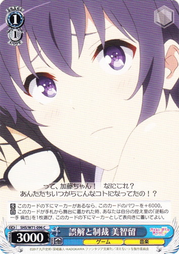 ![]() ![]() | LL/W24-041 密かな企み にこ キャラ ブースターパック ラブライブ! C 色:緑 レベル:1 コスト:0 パワー:4500 ソウル:1 特徴:音楽/オタク 【自】このカードが手札から舞台に置かれた時、あなたは他の自分の《音楽》のキャラ1枚を選び、そのターン中パワーを+1000。 【自】チェンジ[③このカードをクロック置場に置く]あなたのクライマックスフェイズの始めに、あなたはコストを払ってよい。そうしたら、あなたは自分の控え室の「“僕らのLIVE 君とのLIFE” 矢澤 にこ」を1枚選び、このカードがいた枠に置く。 ふふふ・・・・・・こんなこともあろうかと高得点が出やすい曲のピックアップはすでに完了している・・・ 作品名:ラブライブ! School idol project |