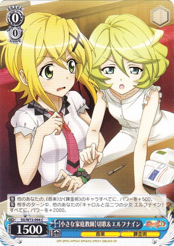 ![]() ![]() | SG/W52-040 【初めてのカラオケ】エルフナイン&キャロル キャラ ブースターパック 戦姫絶唱シンフォギアXD UNLIMITED C 色:緑 レベル:0 コスト:0 パワー:3500 ソウル:1 特徴:錬金術 【永】あなたのクロックが1枚以下なら、このカードはアタックできない。 【自】このカードが手札から舞台に置かれた時、あなたは相手の前列のレベル0以下の《音楽》のキャラを1枚選び、控え室に置いてよい。 キャロル「慌てるな、落ち着け。よし、唄うぞ――エルフナインッ!」 作品名:戦姫絶唱シンフォギアXD UNLIMITED |
