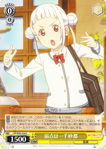 ![]() ![]() | LSP/W92-037 私たちにしかできないステージ イベント ブースターパック ラブライブ!スーパースター!! R 色:黄 レベル:2 コスト:0 【カウンター】次の2つの効果のうちあなたが選んだ1つを行う。 『あなたは自分の《音楽》のキャラを1枚選び、そのターン中、パワーを+2500。』 『あなたの《音楽》のキャラがいるなら、あなたは自分の控え室の《音楽》のキャラを1枚選び、手札に戻す。』 作品名:ラブライブ!スーパースター!! |