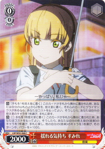 ![]() ![]() | LL/W24-030 音ノ木坂学院3年生 希 キャラ ブースターパック ラブライブ! R 色:緑 レベル:2 コスト:1 パワー:1500 ソウル:1 特徴:音楽/占い トリガー:ソウル 【自】このカードが手札から舞台に置かれた時、あなたは他の自分の《音楽》のキャラを1枚選び、そのターン中、パワーを+2000。 【起】【カウンター】助太刀3000 レベル2[①手札のこのカードを控え室に置く](あなたは自分のフロントアタックされているキャラを1枚選び、そのターン中、パワーを+3000) あの3人、本気みたいやな 作品名:ラブライブ! School idol project |