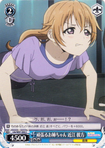 ![]() ![]() | LL/W24-012f “もぎゅっと”love“で接近中!” μ’s キャラ ブースターパック ラブライブ! U 色:黄 レベル:0 コスト:0 パワー:2500 ソウル:1 特徴:音楽 【自】このカードが手札から舞台に置かれた時、そのターン中、このカードのパワーを+1500。 作品名:ラブライブ! School idol project |