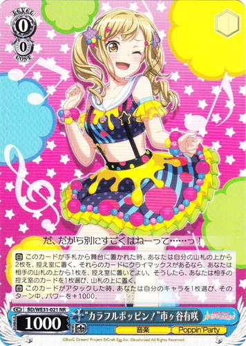 ![]() ![]() | PJS/S91-011 大歓迎バスター!! 鳳えむ キャラ ブースターパック プロジェクトセカイ カラフルステージ! feat. 初音ミク U 色:黄 レベル:0 コスト:0 パワー:2000 ソウル:1 特徴:音楽/ワンダーランズ×ショウタイム 【自】このカードが手札から舞台に置かれた時、あなたは自分の山札の上から2枚を、控え室に置き、そのターン中、このカードのパワーを+X。Xはそれらのカードの《音楽》のキャラの枚数×1000に等しい。 【自】【CXコンボ】この能力は先攻プレイヤーの第1ターンなら発動しない。このカードがアタックした時、クライマックス置場に「レッツ作戦会議!」があり、他のあなたの《音楽》のキャラが2枚以上なら、あなたは自分の控え室のレベル0以下の《音楽》のキャラを1枚まで選び、舞台のキャラのいない枠に置き、そのターン中、このカードのパワーを+500し、そのターン中、あなたは4回目以降のアタックができない。 みんな、がんばろうね~っ☆ 作品名:プロジェクトセカイ カラフルステージ! feat. 初音ミク |