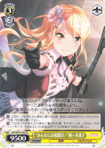 ![]() ![]() | LL/W24-109 “Wonderful Rush” 高坂 穂乃果 キャラ トライアルデッキ ラブライブ! TD 色:黄 レベル:3 コスト:2 パワー:10000 ソウル:2 特徴:音楽 トリガー:ソウル 【自】このカードが手札から舞台に置かれた時、あなたは自分の山札を見て《音楽》のキャラを1枚まで選んで相手に見せ、手札に加える。その山札をシャッフルする。 【自】他のあなたの《音楽》のキャラがアタックした時、そのターン中、このカードのパワーを+1000。 じゃあ始めよ! 作品名:ラブライブ! School idol project |