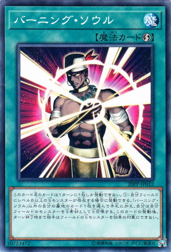 ①:自分フィールドにレベル8以上のSモンスターが存在する場合に発動できる。「バーニング・ソウル」以外の自分の墓地のカード1枚を選んで手札に加え、自分は自分フィールドのモンスターをS素材としてS召喚する。このカードの発動後、ターン終了時まで相手はフィールドのSモンスターを効果の対象にできない。