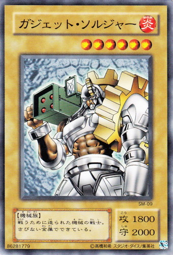 ![]() ![]() | SM-09 ガジェット・ソルジャー モンスター Spell of Mask ―仮面の呪縛― ノーマル 属性:炎 分類:通常 種族:機械族 レベル:6 攻撃力:1800 守備力:2000 戦うために造られた機械の戦士。さびない金属でできている。 |