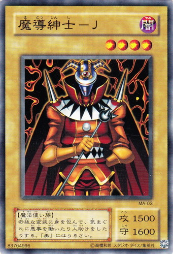 ![]() ![]() | MA-03 魔導紳士―J モンスター Mythological Age ―蘇りし魂― ノーマル 属性:闇 分類:通常 種族:魔法使い族 レベル:4 攻撃力:1500 守備力:1600 奇抜な変装に身を包んで、気まぐれに悪事を働いたり人助けをしたりする。「美」にはうるさい。 |