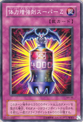 ![]() ![]() | MA-48 体力増強剤スーパーZ 罠 Mythological Age ―蘇りし魂― ノーマル 分類:通常 このターン相手から2000ポイント以上のダメージを受けた場合、そのダメージがライフポイントから引かれる前に、一度だけライフポイントを4000回復する。 |