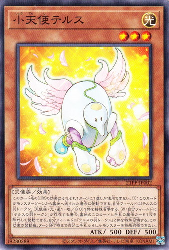 ![]() ![]() | 21PP-JP002 小天使テルス モンスター PREMIUM PACK 2021 ノーマル 属性:光 分類:効果 種族:天使族 レベル:3 攻撃力:500 守備力:500 このカード名の①②の効果はそれぞれ1ターンに1度しか使用できない。 ①:このカードがモンスターゾーンから墓地に送られた場合に発動できる。自分フィールドに「テルスの羽トークン」(天使族・光・星1・攻/守0)1体を特殊召喚する。 ②:自分フィールドに「テルスの羽トークン」が存在する場合、墓地のこのカードと手札の魔法カード1枚を除外して発動できる。自分フィールドに「テルスの羽トークン」2体を特殊召喚する。この効果の発動後、ターン終了時まで自分は手札からしかモンスターを特殊召喚できない。 |