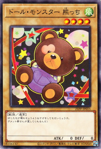 ![]() ![]() | 21PP-JP015 ドール・モンスター 熊っち モンスター PREMIUM PACK 2021 ノーマル 属性:風 分類:通常 種族:獣族 レベル:4 攻撃力:0 守備力:0 ぼくたちが壊れちゃうようなケガをしてもだいじょうぶ。 デメット爺さんが直してくれるんだ! |