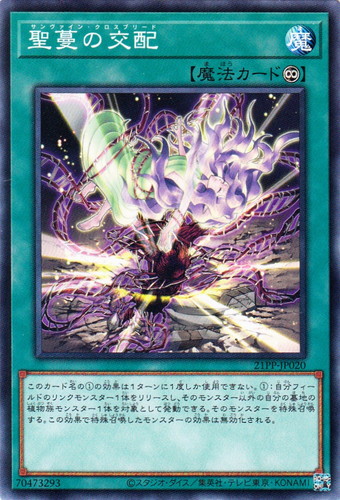 ![]() ![]() | 21PP-JP020 聖蔓の交配 魔法 PREMIUM PACK 2021 ノーマル 分類:永続 このカード名の①の効果は1ターンに1度しか使用できない。 ①:自分フィールドのリンクモンスター1体をリリースし、そのモンスター以外の自分の墓地の植物族モンスター1体を対象として発動できる。そのモンスターを特殊召喚する。この効果で特殊召喚したモンスターの効果は無効化される。 |