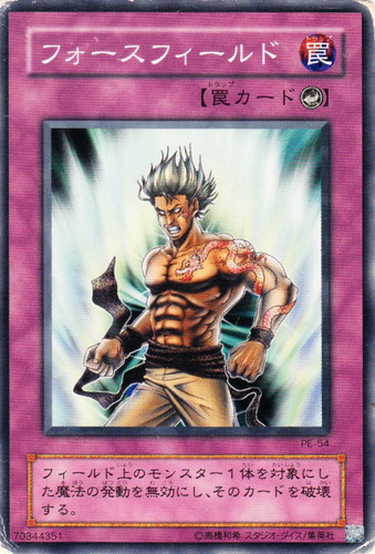 ![]() ![]() | PE-54 フォースフィールド 罠 STRUCTURE DECK ―ペガサス・J・クロフォード編― ノーマル 分類:カウンター フィールド上のモンスター1体を対象にした魔法の発動を無効にし、そのカードを破壊する。 |