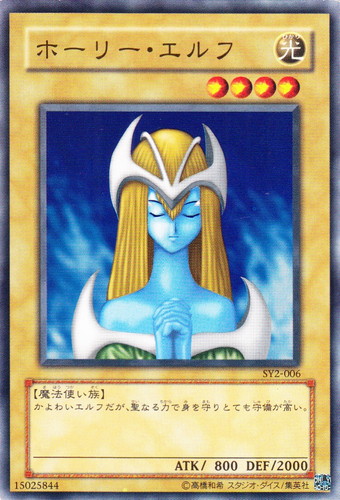 ![]() ![]() | SY2-006 ホーリー・エルフ モンスター STRUCTURE DECK ―遊戯編― Volume.2 ノーマル 属性:光 分類:通常 種族:魔法使い族 レベル:4 攻撃力:800 守備力:2000 かよわいエルフだが、聖なる力で身を守りとても守備が高い。 |