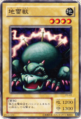 ![]() ![]() | PG-43 地雷獣 モンスター 幻の召喚神 ―PHANTOM GOD― ノーマル 属性:地 分類:通常 種族:雷族 レベル:4 攻撃力:1200 守備力:1300 強力な電磁波をバリバリとまわりに放出して攻撃する。 |