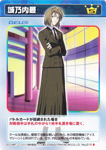 ![]() ![]() | No.019 城乃内最 デウス 基本セット C コスト:5 バトルカードが回避された場合 対戦相手は手札の中から1枚手札置き場に置く。 クールな美貌と、優雅で冷徹な戦いぶりから、氷の精密機械(アイスマシーン)と呼ばれている。だが、内には熱いものを秘めている。 |