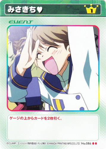 ![]() ![]() | No.086 みさきち♥ イベント 基本セット U コスト:1 ゲージの上からカードを2枚引く。 |