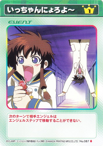 ![]() ![]() | No.087 いっちゃんにょろよ~ イベント 基本セット C コスト:1 次のターンで相手エンジェルは エンジェルステップで移動することができない。 |