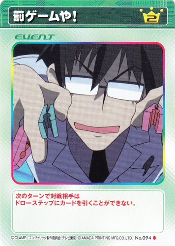 ![]() ![]() | No.094 罰ゲームや! イベント 基本セット C コスト:2 次のターンで対戦相手はドローステップにカードを引くことができない。 |