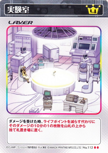 ![]() ![]() | No.112 実験室 レイヤー 基本セット U コスト:4 ダメージを受けた時、ライフポイントを減らす代わりにそのダメージの10分の1の枚数を山札の上から捨て札置き場に置く。 |