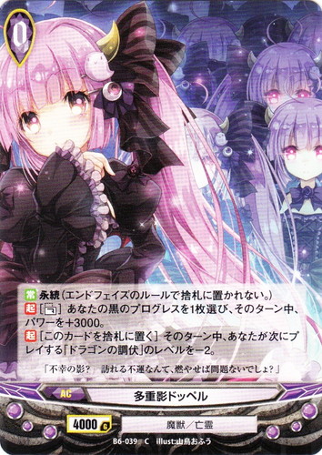![]() ![]() | B6-039 多重影ドッペル アクション ブースターパック 第6章 救済と希望の剣 C 世界:黒 分類:魔獣/亡霊 レベル:0 ガード:4000 【常】永続(エンドフェイズのルールで捨札に置かれない。) 【起】[【フォール】]あなたの黒のプログレスを1枚選び、そのターン中、パワーを+3000。 【起】[このカードを捨札に置く]そのターン中、あなたが次にプレイする「ドラゴンの調伏」のレベルを-2。 「不幸の影>?訪れる不運なんて、燃やせば問題ないでしょ?」 illust:山鳥おふう |
