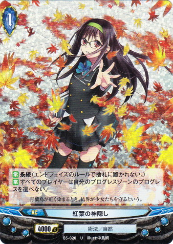 ![]() ![]() | B5-020 紅葉の神隠し アクション ブースターパック 第5章 緑の門を喚ぶ少女 U(foil) 世界:青 分類:術法/自然 レベル:1 ガード:4000 【常】永続(エンドフェイズのルールで捨札に置かれない。) 【常】すべてのプレイヤーは自分のプログレスゾーンのプログレスを選べない。 青蘭島が紅く染まるとき、結界が少女たちを守るという。 illust:中島鯛 |