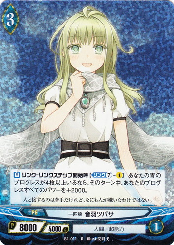![]() ![]() | B1-011 一匹狼 音羽ツバサ プログレス ブースターパック 第1章 青蘭の聖少女 R(foil) 世界:青 種族:人間 分類:超能力 レベル:3 パワー:8000 ガード:4000 ストライク:1 【自】リンク-リンクステップ開始時【リンク⑦-4】あなたの青のプログレスが4枚以上いるなら、そのターン中、あなたのプログレスすべてのパワーを+2000。 人と接するのは苦手だけれど、なにも人が嫌いなわけではない。 illust:閏月戈 |