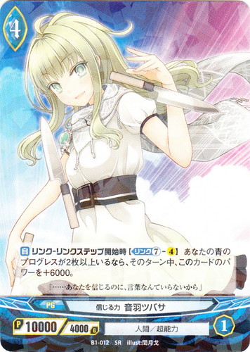 ![]() ![]() | B1-012 信じる力 音羽ツバサ プログレス ブースターパック 第1章 青蘭の聖少女 SR 世界:青 種族:人間 分類:超能力 レベル:4 パワー:10000 ガード:4000 ストライク:1 【自】リンク-リンクステップ開始時【リンク⑦-4】あなたの青のプログレスが2枚以上いるなら、そのターン中、このカードのパワーを+6000。 「・・・・・・あなたを信じるのに、言葉なんていらないから」 illust:閏月戈 |
