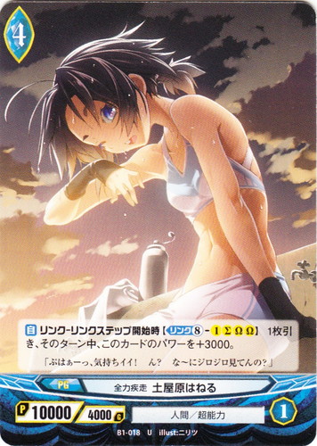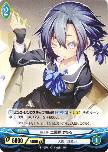 ![]() ![]() | B1-016 陸上部 土屋原はねる プログレス ブースターパック 第1章 青蘭の聖少女 C 世界:青 種族:人間 分類:超能力 レベル:2 パワー:6000 ガード:4000 ストライク:1 【自】リンク-リンクステップ開始時【リンク⑤-2Σ】そのターン中、このカードのパワーを+6000。 「アスリートだからね!」はねるはそう言うと、人懐っこく笑う。 illust:ニリツ |