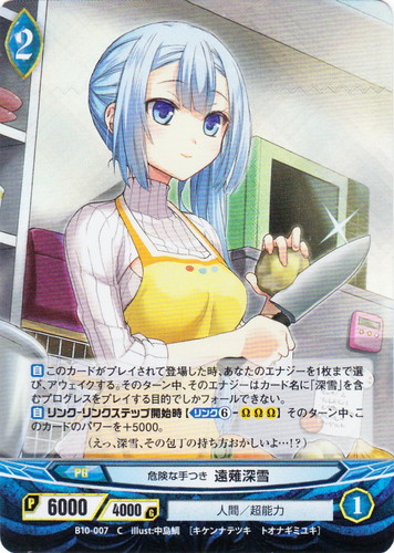![]() ![]() | B10-007 危険な手つき 遠薙深雪 プログレス ブースターパック 第10章 零が示す真実 C(foil) 世界:青 種族:人間 分類:超能力 レベル:2 パワー:6000 ガード:4000 ストライク:1 【自】このカードがプレイされて登場した時、あなたのエナジーを1枚まで選び、アウェイクする。そのターン中、そのエナジーはカード名に「深雪」を含むプログレスをプレイする目的でしかフォールできない。 【自】リンク-リンクステップ開始時【リンク⑥-ΩΩΩ】そのターン中、このカードのパワーを+5000。 (えっ、深雪、その包丁の持ち方おかしいよ・・・!?) illust:中島鯛 |
