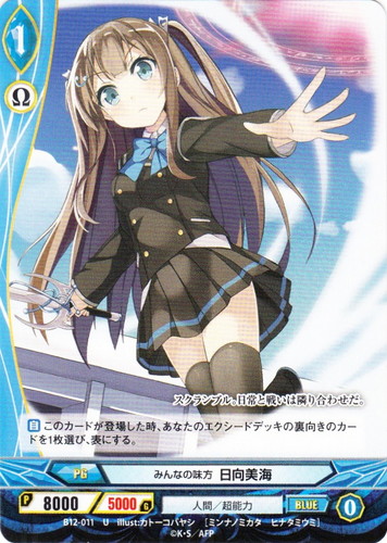 ![]() ![]() | B12-011 みんなの味方 日向美海 プログレス ブースターパック 第12章 たった一つの願い U 世界:青 リンク:Ω 種族:人間 分類:超能力 レベル:1 パワー:8000 ガード:5000 【自】このカードが登場した時、あなたのエクシードデッキの裏向きのカードを1枚選び、表にする。 スクランブル。日常と戦いは隣り合わせだ。 illust:カトーコバヤシ |