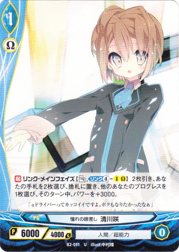 ![]() ![]() | B1-023 進化する可能性 日向美海 プログレス ブースターパック 第1章 青蘭の聖少女 SR 世界:青 種族:人間 分類:超能力 レベル:4 パワー:10000 ガード:4000 ストライク:1 【自】リンク-リンクステップ開始時【リンク⑧-2ΩΩ】そのターン中、あなたの手札2枚につき、このカードのパワーを+3000。 「ほら、行こう!信頼してるよ、私たちのαドライバー!」 illust:カントク |