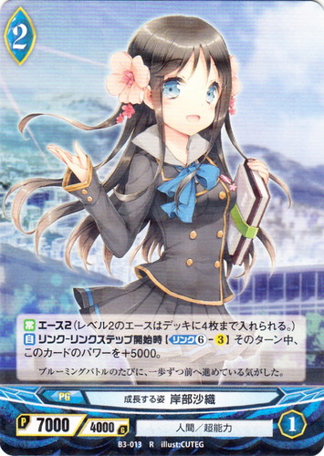 ![]() ![]() | B3-013 成長する姿 岸部沙織 プログレス ブースターパック 第3章 絶対進化の切札たち R 世界:青 種族:人間 分類:超能力 レベル:2 パワー:7000 ガード:4000 ストライク:1 【常】エース2(レベル2のエースはデッキに4枚まで入れられる。) 【自】リンク-リンクステップ開始時【リンク⑥-3】そのターン中、このカードのパワーを+5000。 ブルーミングバトルのたびに、一歩ずつ前へ進めている気がした。 illust:CUTEG |